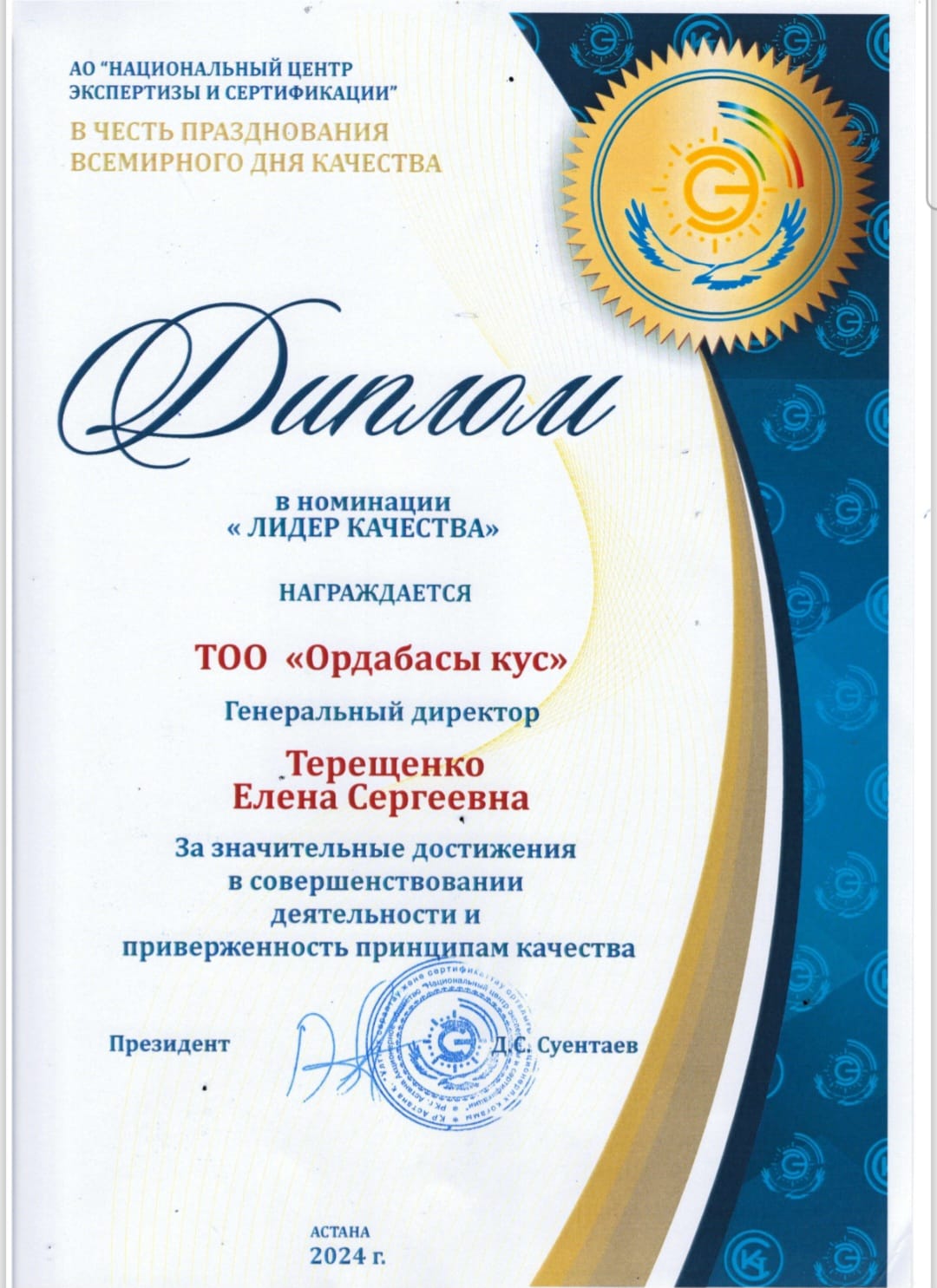 ТОО «Ордабасы Құс» удостоено диплома в номинации «Лидер качества» за значительные достижения в совершенствовании деятельности и приверженность принципам качества.